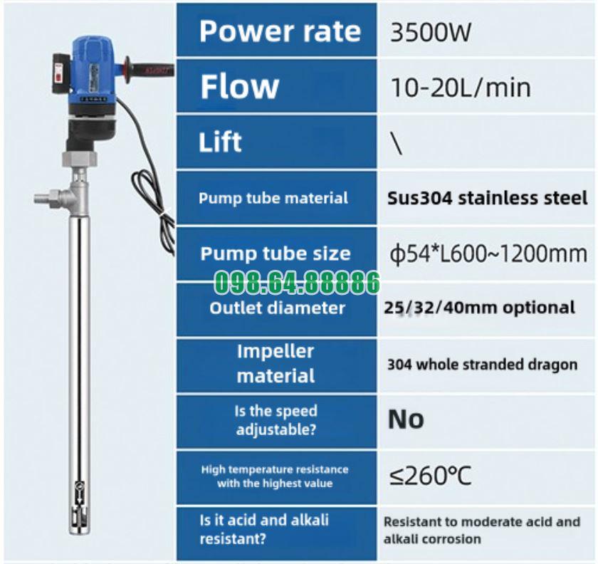 Bơm điện cầm tay dạng trục đứng JDT-3500W-JLG260 nổi bật với khả năng chịu nhiệt cực cao, đáp ứng tốt nhu cầu bơm các loại chất lỏng nóng trong môi trường công nghiệp khắc nghiệt.
