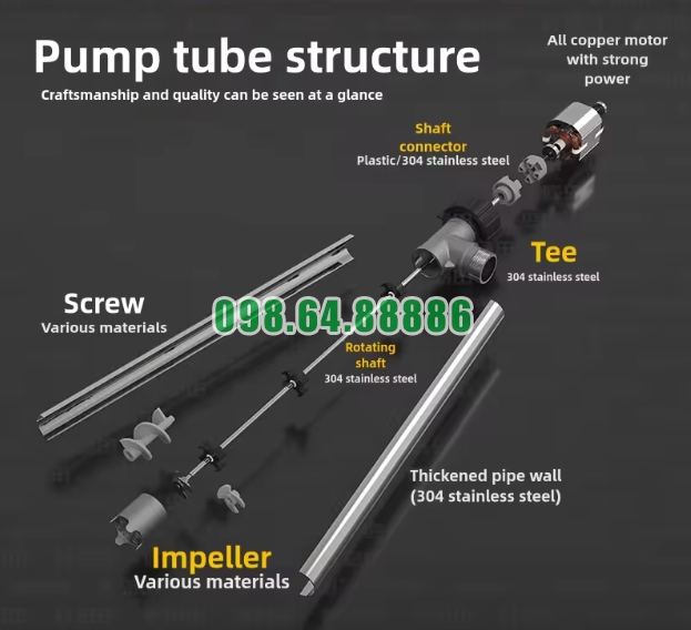 Sau khi động cơ hoạt động, lực quay sẽ được truyền qua trục quay inox 304 xuống phần cánh bơm nằm bên dưới ống bơm. Đây là bộ phận trung gian giúp kết nối giữa động cơ và cụm hút đẩy chất lỏng.