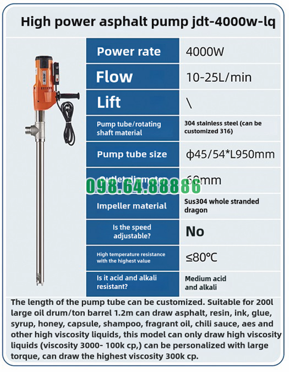 Điểm đặc biệt của máy bơm nhựa đường cầm tay hút từ thùng phuy JDT-4000W-LQ là nguyên lý hoạt động được tối ưu cho chất lỏng sệt. Máy không thiết kế cho chất lỏng loãng, mà tập trung vào khả năng xử lý môi chất có độ nhớt từ 3000–100.000 cps, có thể tùy chỉnh lên đến 300.000 cps.