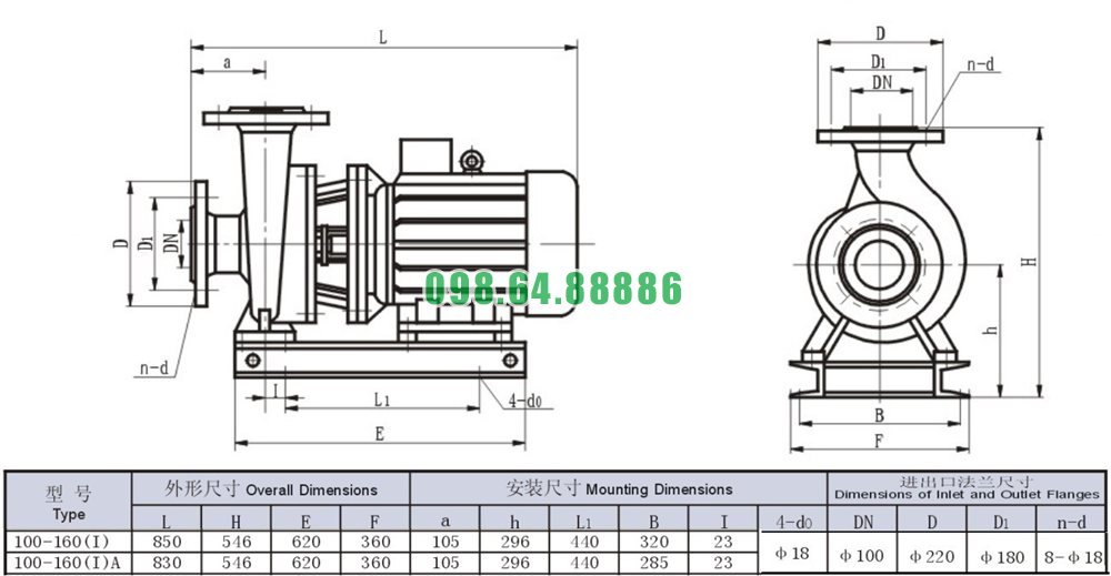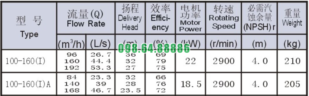 Bảng thông số kỹ thuật bơm nước li tâm trục ngang SLW100- ISW100-160-I