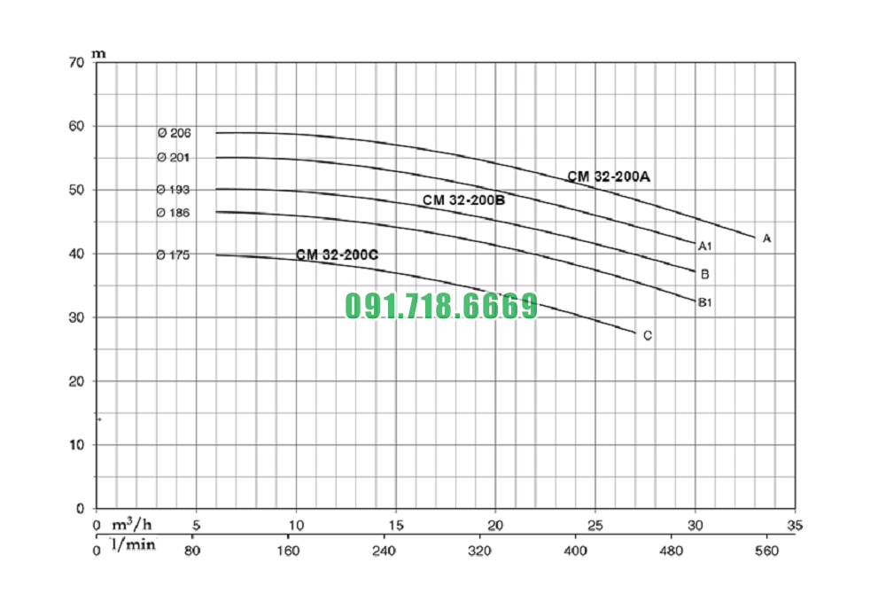 Đường cong hiệu suất máy bơm nước li tâm CM32-200A hiệu suất 36 m3/h