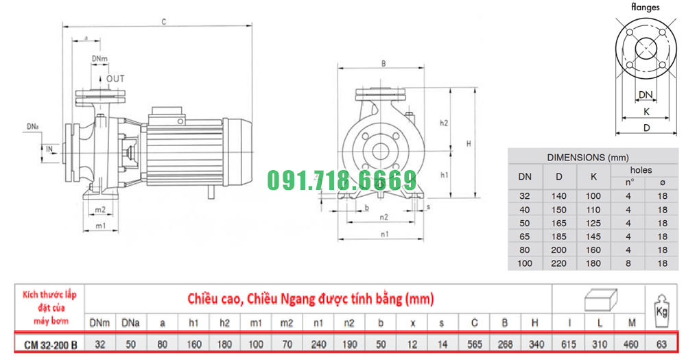 Kích thước máy bơm nước li tâm CM32-200A hiệu suất 36 m3/h