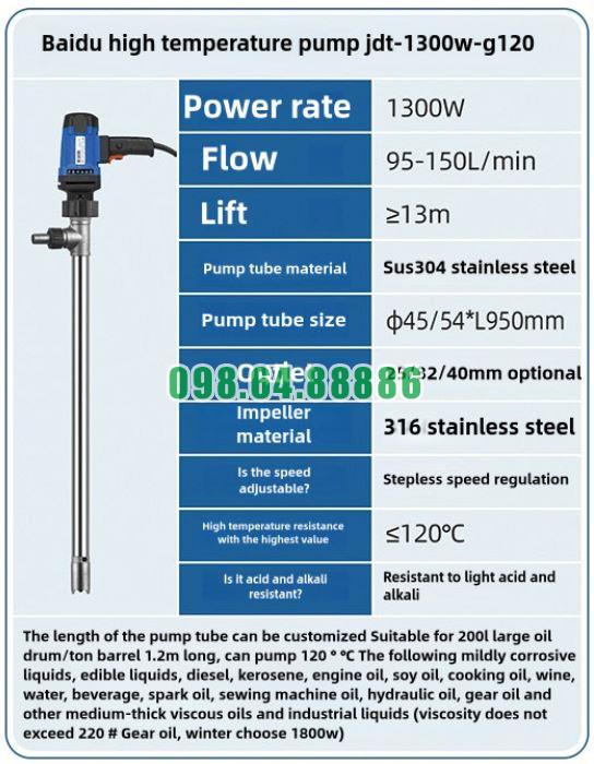 Sự tương thích này giúp bơm thùng phuy nhiệt độ cao JDT-1300W-G120 vận hành êm và bền bỉ.
