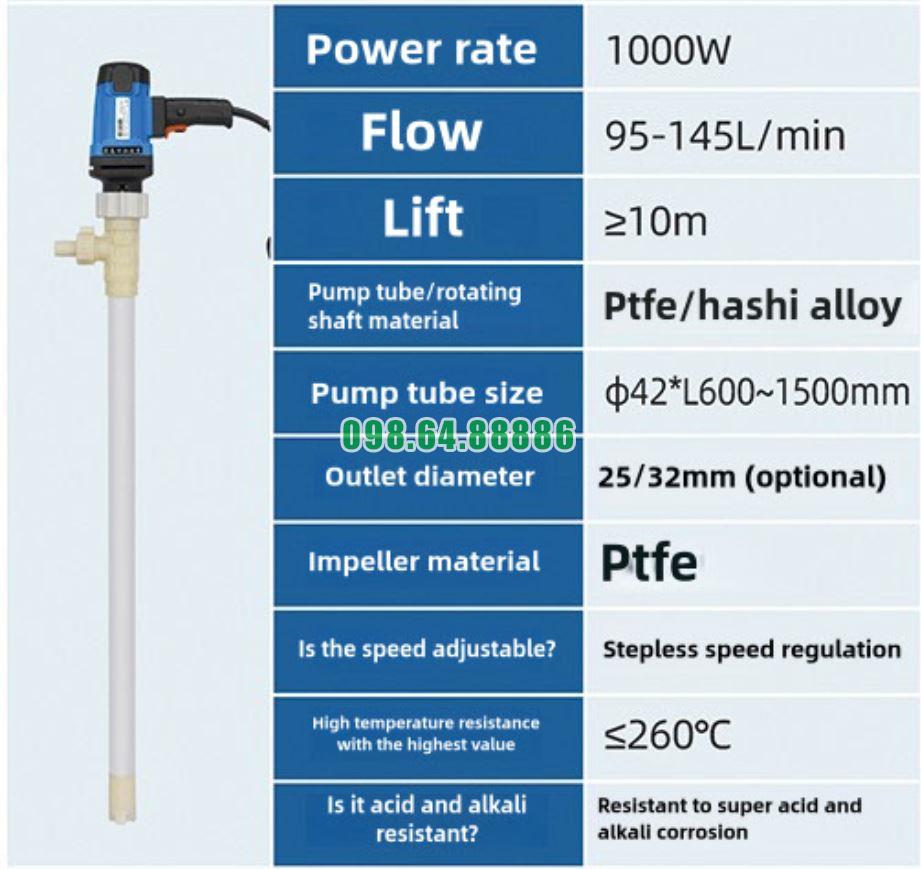 Bơm điện nhúng thùng phuy hóa chất chịu ăn mòn cao cấp model JDT-1000W-PTFE