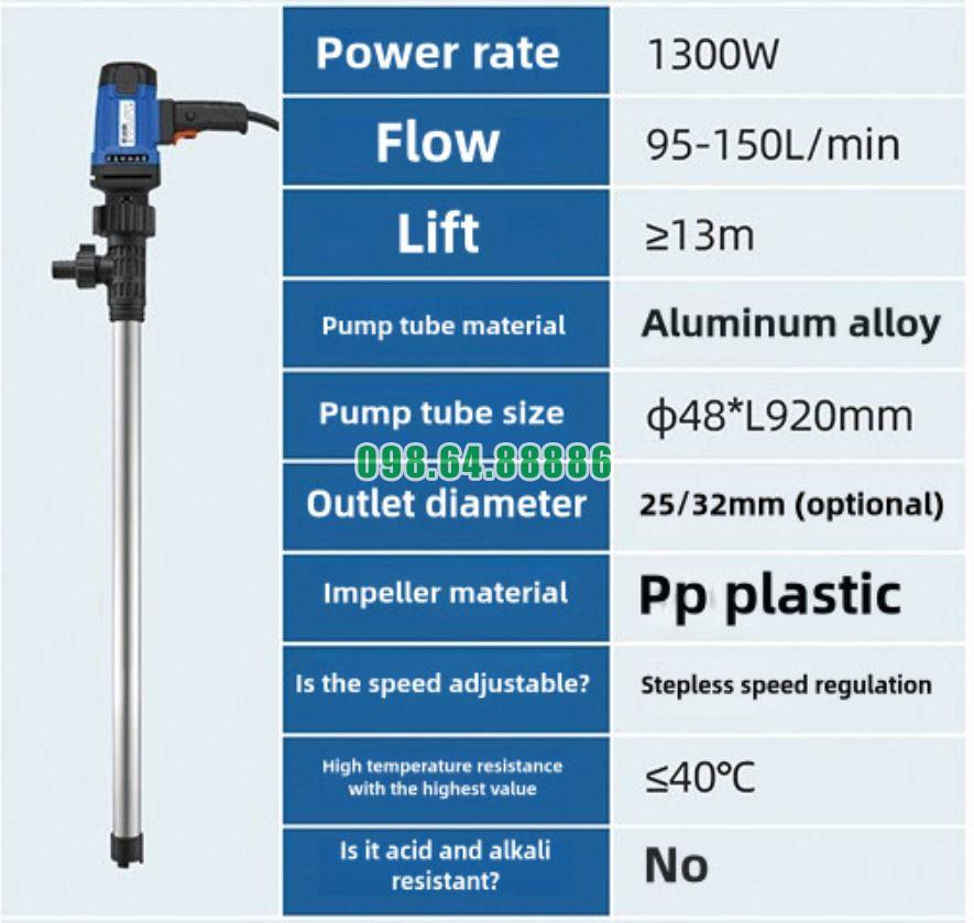 Máy bơm điện nhúng thùng phuy JDT-1300W-L92 được dùng để chiết rót xăng, dầu diesel hoặc các sản phẩm dầu mỏ từ thùng phuy sang can, bồn chứa trung gian hoặc thiết bị sử dụng. Nhờ khả năng hút trực tiếp từ đáy thùng, máy giúp quá trình chiết rót diễn ra liên tục, hạn chế hao hụt và tiết kiệm thời gian thao tác.