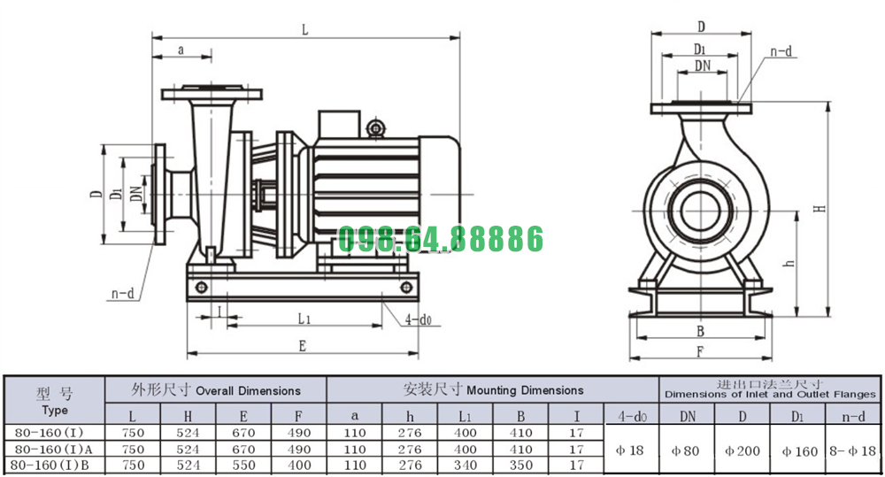 Bản vẽ cấu tạo và kích thước bơm li tâm trục ngang mã SLW80-ISW80-160-I lưu lượng 130 m3/h