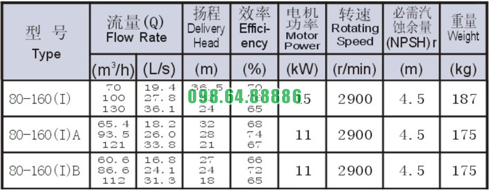 Bảng thông số kỹ thuật bơm li tâm trục ngang mã SLW80-ISW80-160-I lưu lượng 130 m3/h
