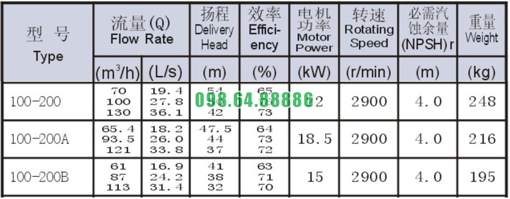 Bảng thông số kỹ thuật bơm li tâm trục ngang model SLW100-ISW100-200 công suất 36.1 L/s