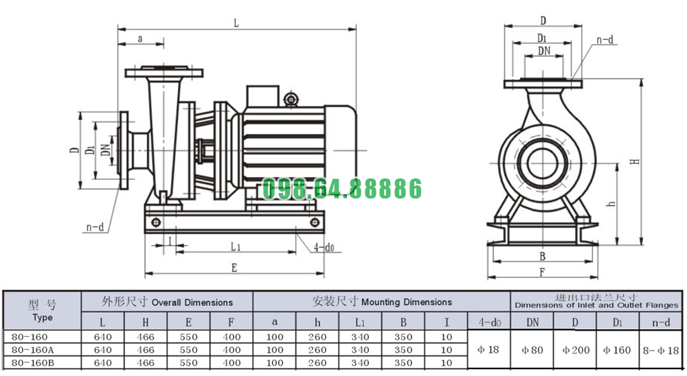 Bản vẽ cấu tạo và kích thước bơm nước li tâm trục ngang động cơ 7.5 kw SLW80-ISW80-160