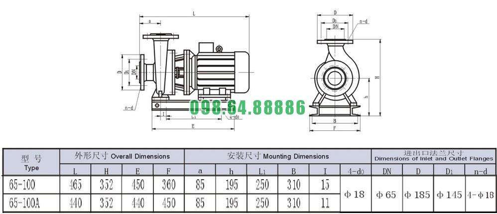Bản vẽ cấu tạo và kích thước bơm nước li tâm trục ngang hút sâu 2.5m model SLW-ISW65-100