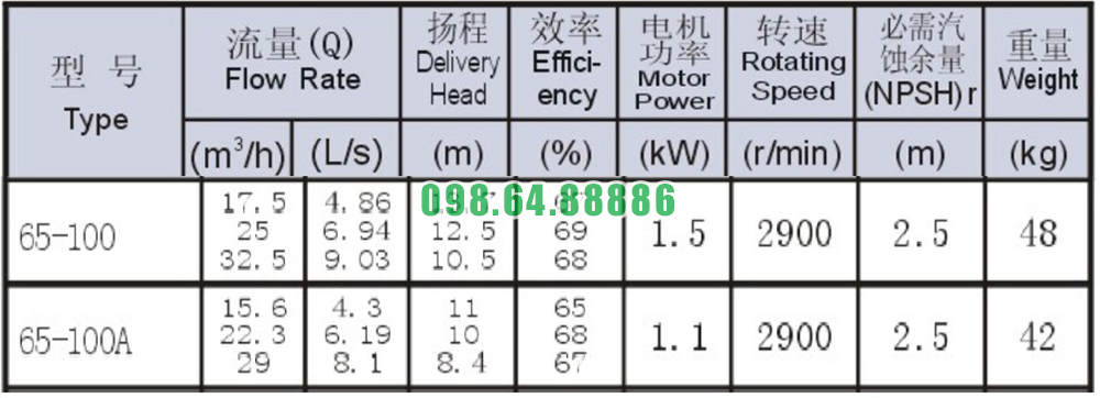 Bảng thông số kỹ thuật bơm nước li tâm trục ngang hút sâu 2.5m model SLW-ISW65-100