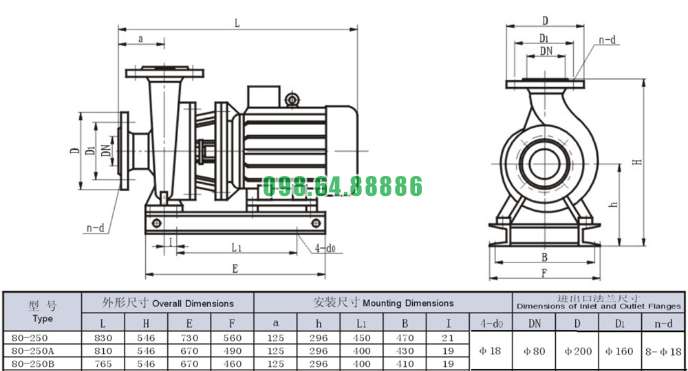 Bản vẽ cấu tạo và kích thước bơm nước nằm ngang SLW80-ISW80-250 lưu lượng từ 9.72 L/s - 18.1 L/s