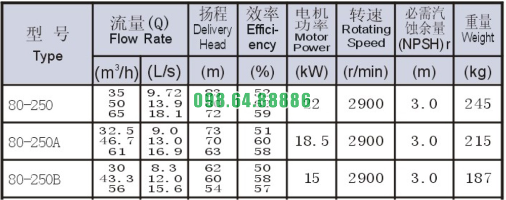 Bảng thông số kỹ thuật bơm nước nằm ngang SLW80-ISW80-250 lưu lượng từ 9.72 L/s - 18.1 L/s