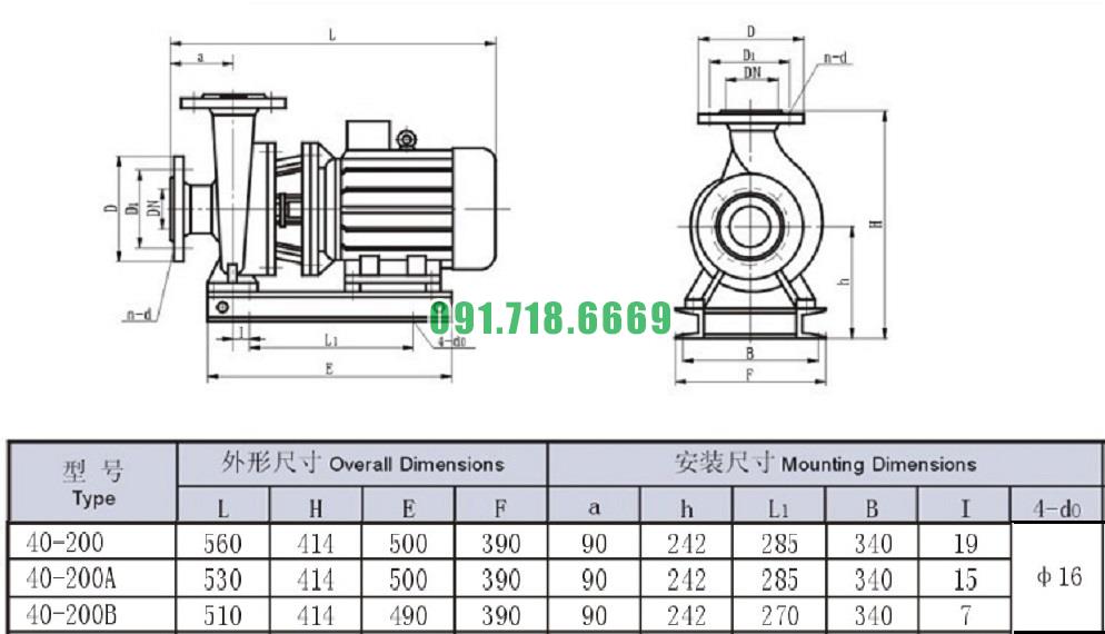 Bản vẽ cấu tạo và kích thước bơm nước trục ngang SLW-ISW40-200-I hiệu suất max 16.3 m3/h