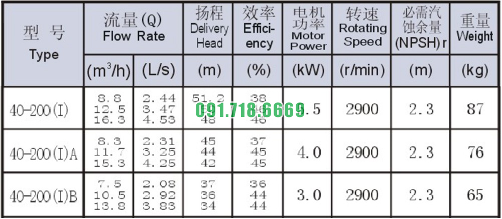 Bảng thông số kỹ thuật bơm nước trục ngang SLW-ISW40-200-I hiệu suất max 16.3 m3/h