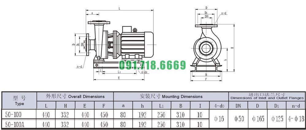 Bản vẽ cấu tạo và kích thước bơm nước trục ngang SLW-ISW50-100 hiệu suất max 16.3 m3/h