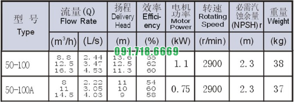 Bảng thông số kỹ thuật bơm nước trục ngang SLW-ISW50-100 hiệu suất max 16.3 m3/h