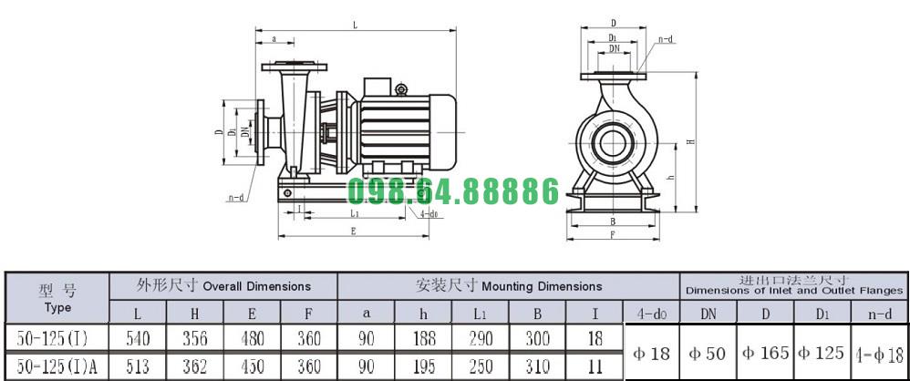 Bảng thông số kỹ thuật bơm nước trục ngang SLW-ISW50-125-I lưu lượng 9.03 L/s