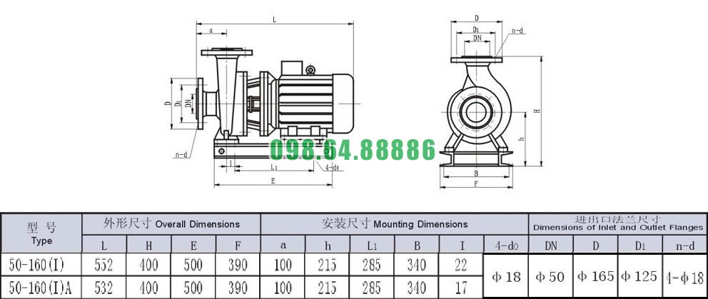Bản vẽ cấu tạo và kích thước bơm nước trục ngang SLW-ISW50-160-I hiệu suất max 32.5 m3/h