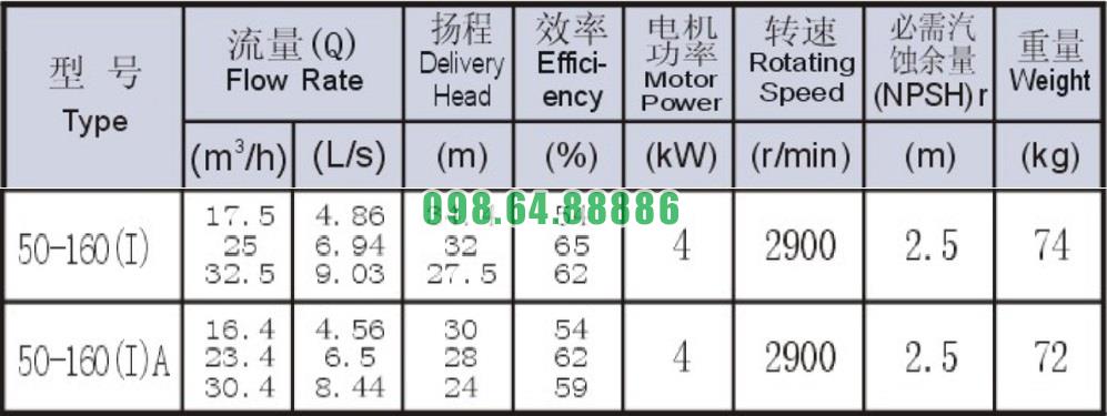 Bảng thông số kỹ thuật bơm nước trục ngang SLW-ISW50-160-I hiệu suất max 32.5 m3/h