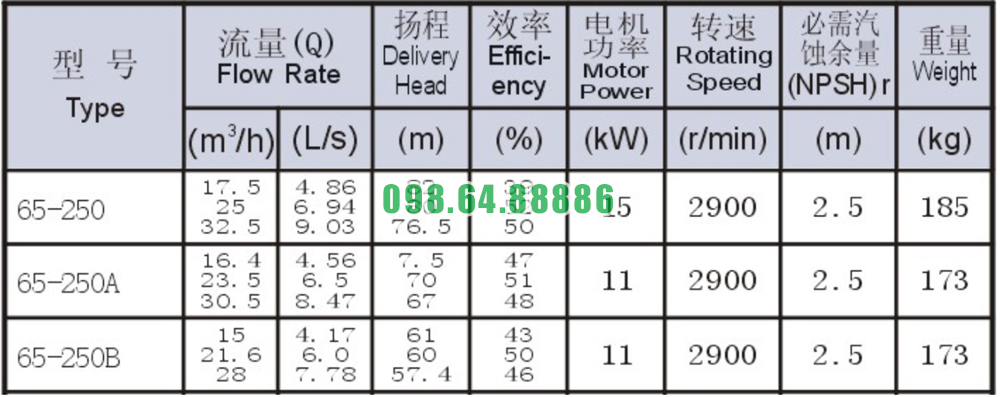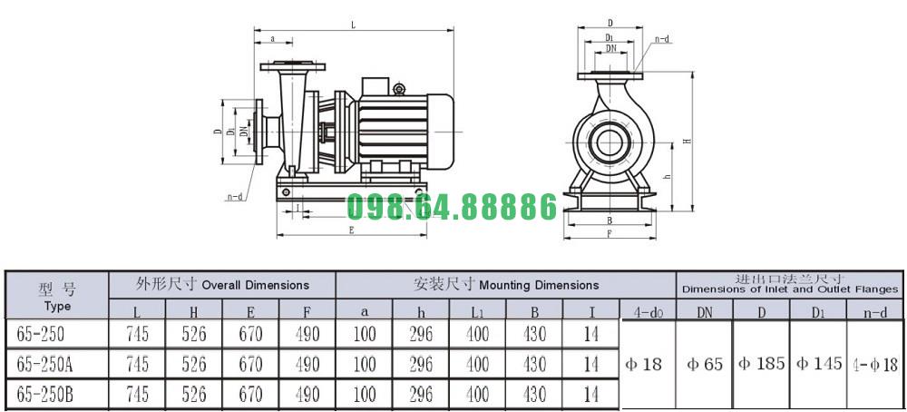 Bảng thông số kỹ thuật bơm nước trục ngang SLW65-ISW65-250 động cơ 15 kw