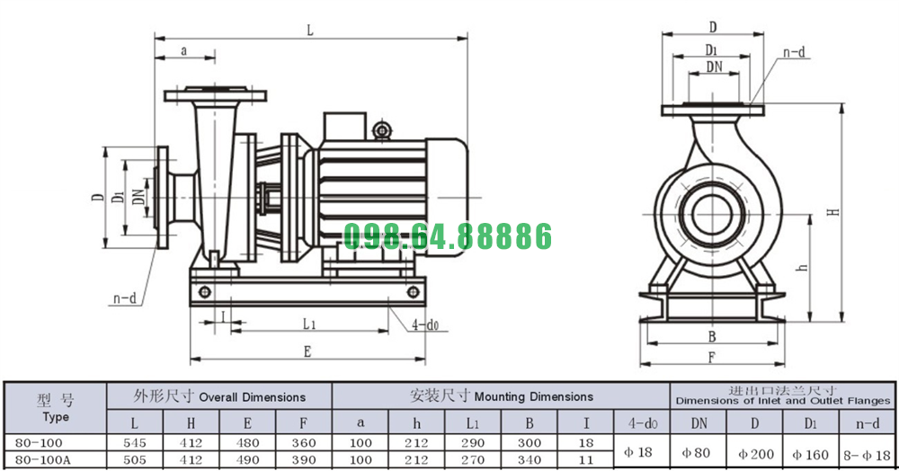 Bản vẽ cấu tạo và kích thước bơm nước trục ngang SLW80-ISW80-100 hiệu suất max 65 m3/h