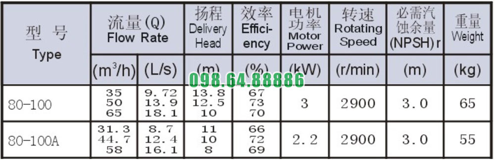 Bảng thông số kỹ thuật bơm nước trục ngang SLW80-ISW80-100 hiệu suất max 65 m3/h