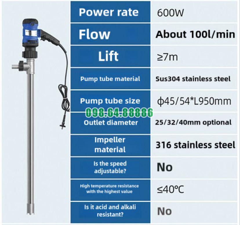 Bơm thùng phuy điện model JDT-600W-304SUS hoạt động liên tục nhờ động cơ 600W mạnh mẽ, thân bơm inox 304SUS bền bỉ và hệ thống truyền động tối ưu cho vận hành dài hạn. Thiết bị đảm bảo dòng chảy ổn định, ít rung, ít nóng và phù hợp cho các doanh nghiệp cần bơm hút chất lỏng nhanh – đều – liên tục trong môi trường công nghiệp.
