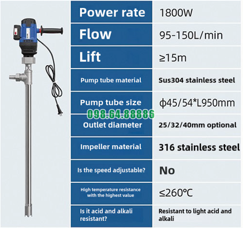 Thiết kế nhỏ gọn và tiện lợi của bơm thùng phuy lỏng nhiệt độ cao JDT-1800W-G260 là kết quả của việc tối ưu kết cấu trục đứng, thiết kế tích hợp và thân ống gọn nhẹ. Nhờ đó, bơm không chỉ dễ lắp đặt, dễ di chuyển và dễ bảo quản mà còn đảm bảo hiệu suất cao và độ bền ổn định, trở thành giải pháp lý tưởng cho các ứng dụng bơm chất lỏng nhiệt độ cao trong môi trường công nghiệp hiện đại.