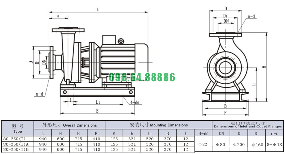 Bản vẽ cấu tạo và kích thước bơm nước trục ngang model SLW80-ISW80-250-I hiệu suất max 130 m3/h