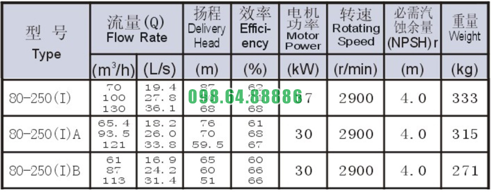 Bảng thông số kỹ thuật bơm nước trục ngang model SLW80-ISW80-250-I hiệu suất max 130 m3/h