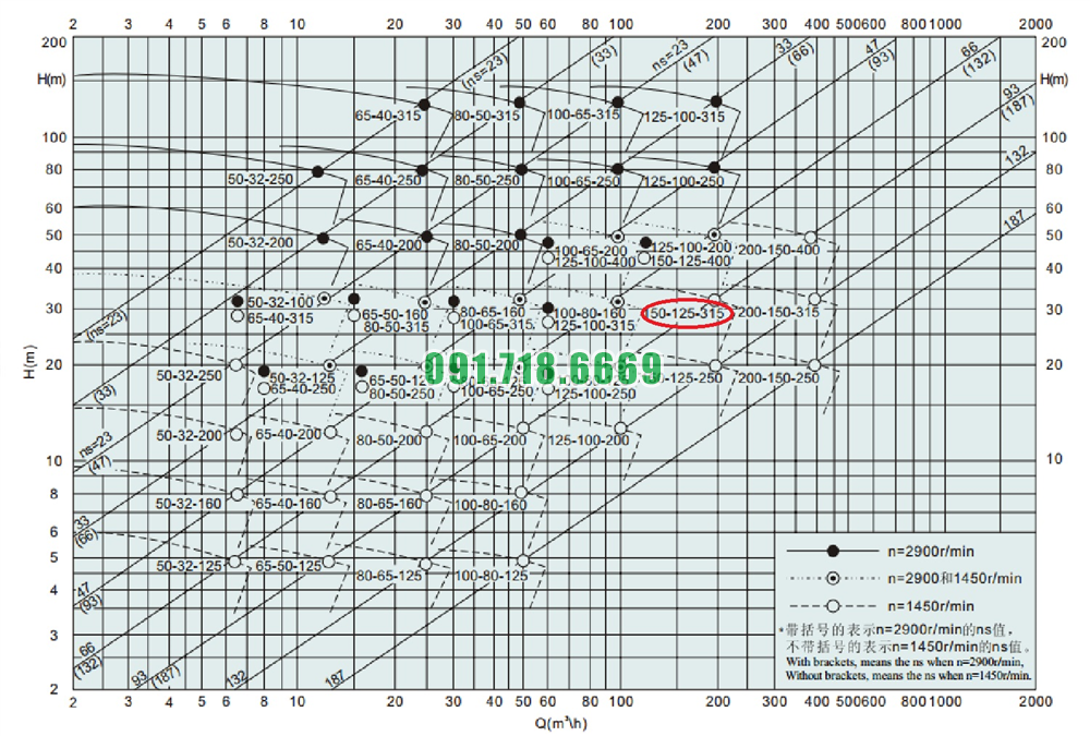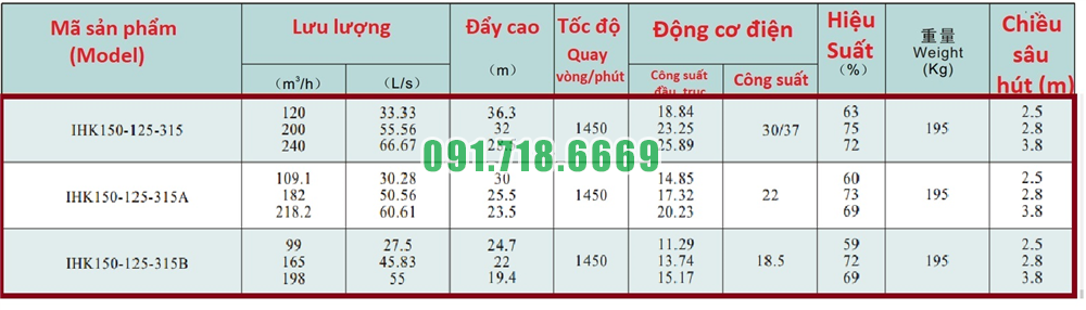 Bảng lưu lượng của máy bơm nước li tâm cánh hở IHK150-125-315 hiệu suất 240 m3/h