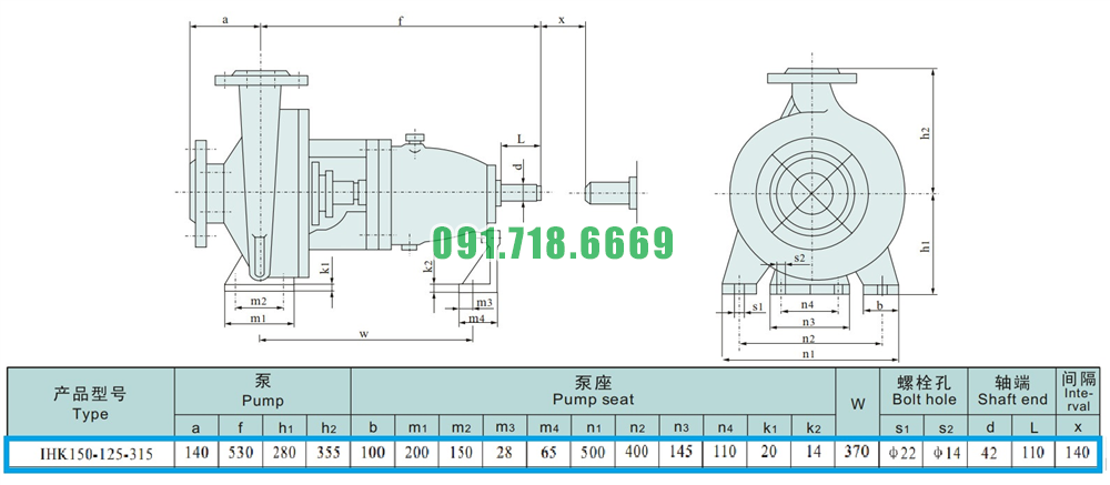 Kích thước của đầu máy bơm nước li tâm cánh hở IHK150-125-315 hiệu suất 240 m3/h