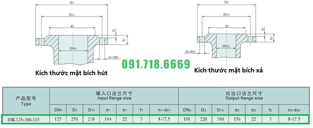 Kích thước mặt bích của máy bơm nước li tâm cánh hở IHK150-125-315 hiệu suất 240 m3/h