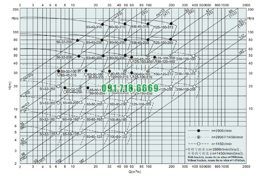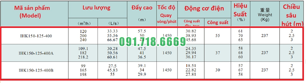 Bảng lưu lượng của máy bơm nước li tâm cánh hở IHK150-125-400 hiệu suất 240 m3/h