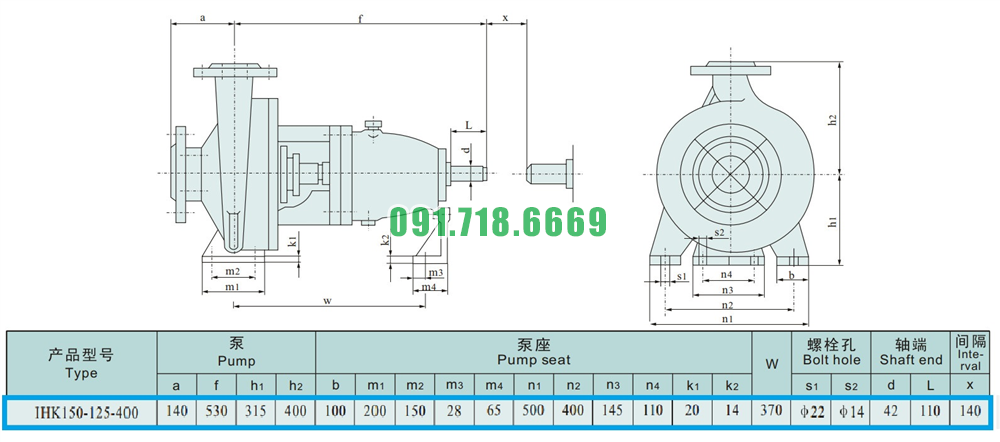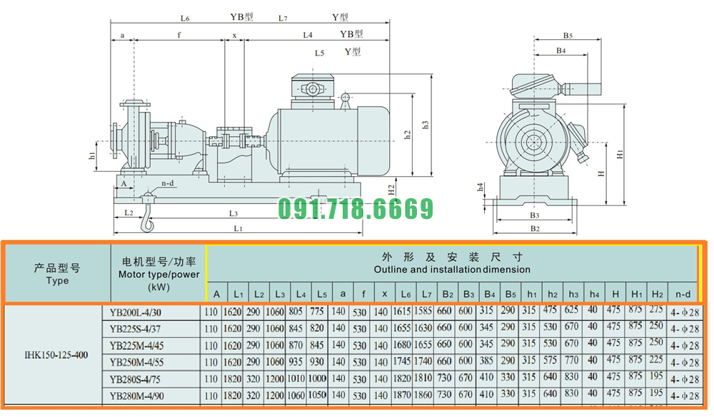 Kích thước của đầu máy bơm nước li tâm cánh hở IHK150-125-400 hiệu suất 240 m3/h