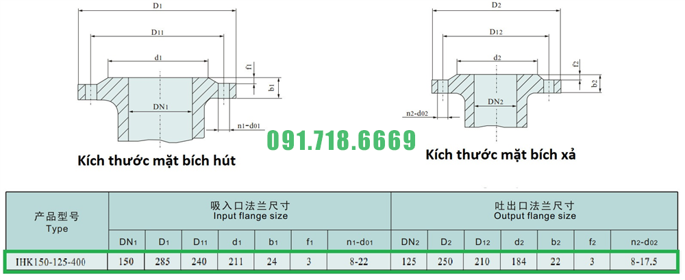 Kích thước mặt bích của máy bơm nước li tâm cánh hở IHK150-125-400 hiệu suất 240 m3/h