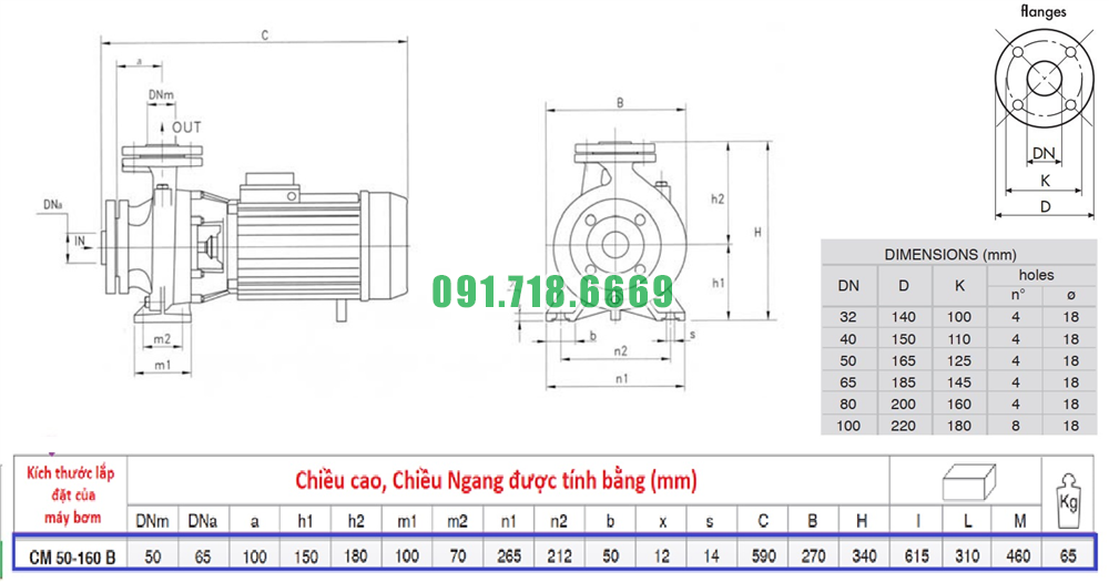 Kích thước máy bơm nước sạch li tâm CM50-160B hiệu suất 78 m3/h
