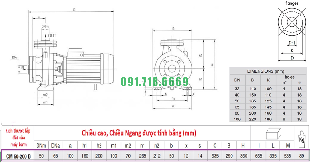 Kích thước máy bơm nước sạch li tâm CM50-200B hiệu suất 72 m3/h