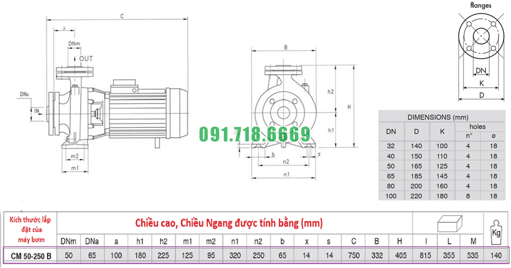 Kích thước máy bơm nước sạch li tâm CM50-250B hiệu suất 78 m3/h