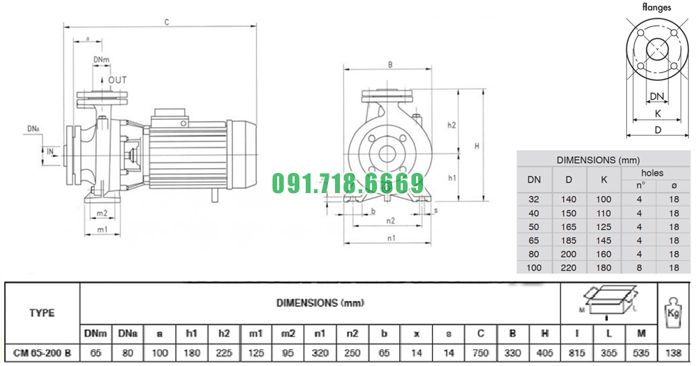 | CM65 - 200B | 132 m3 / h | 50 m | 18.5 kw | 380 v | Dn 80 / 65 mm | Vỏ gang FC200