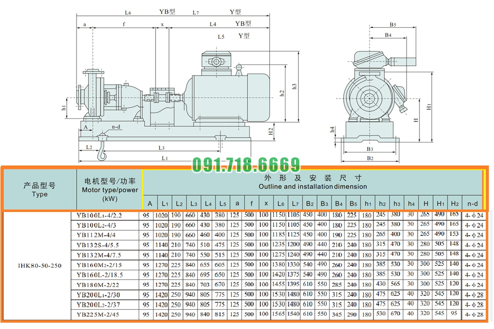 Kích thước của đầu bơm li tâm cánh hở công suất 37 kw model IHK100-65-250