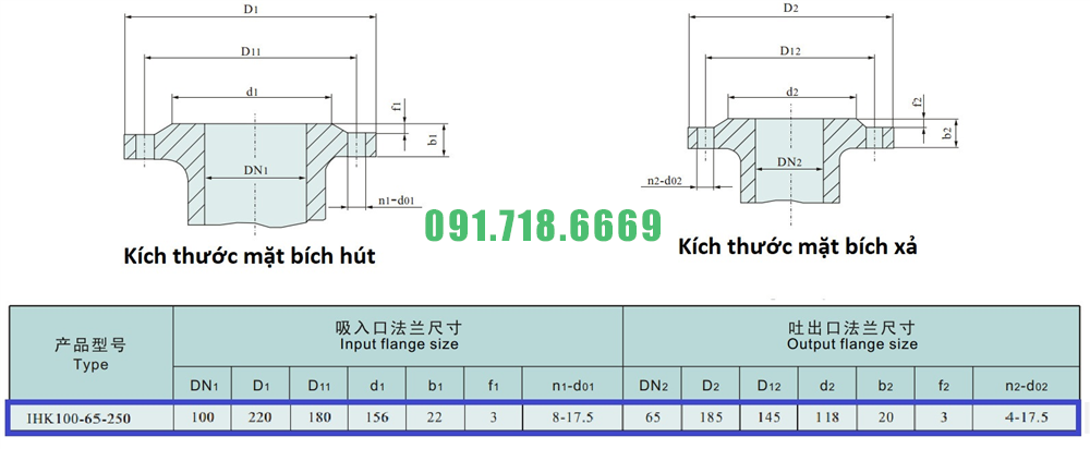 Kích thước mặt bích của bơm li tâm cánh hở công suất 37 kw model IHK100-65-250