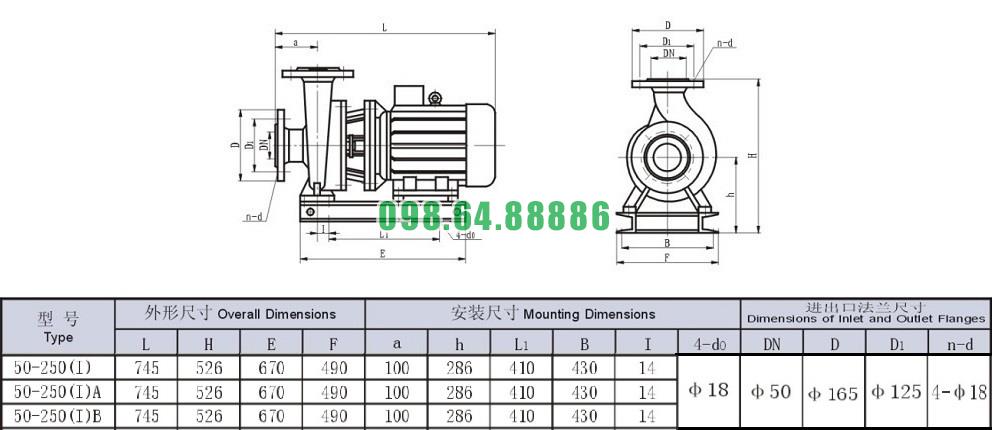 Bản vẽ cấu tạo và kích thước bơm nước trục ngang SLW-ISW50-250-I lưu lượng 7.86 L/s