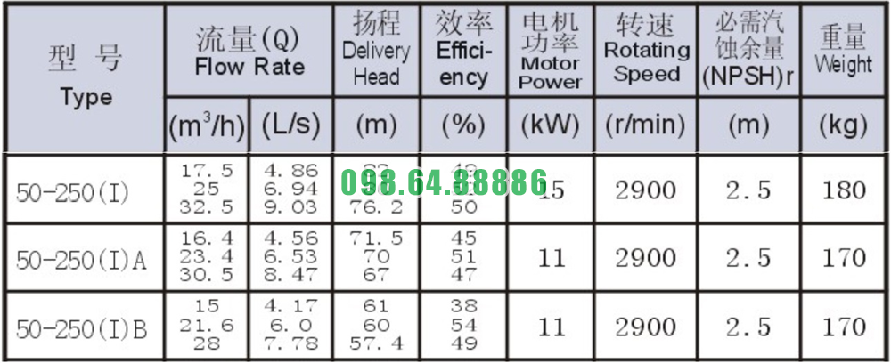 Bảng thông số kỹ thuật bơm nước trục ngang SLW-ISW50-250-I lưu lượng 7.86 L/s