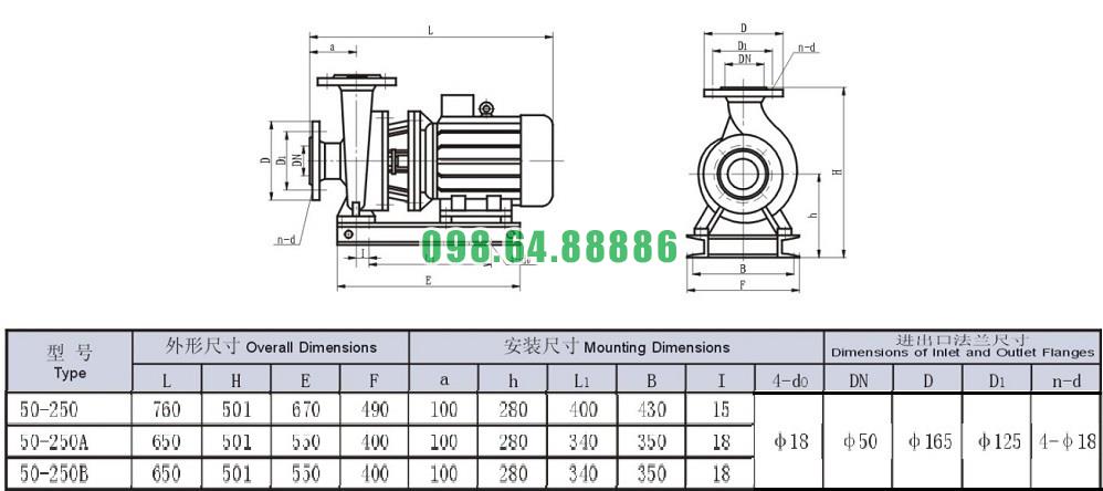 Bản vẽ cấu tạo và kích thước bơm nước trục ngang SLW-ISW50-250 lưu lượng 4.53 L/s