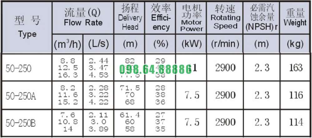 Bảng thông số kỹ thuật bơm nước trục ngang SLW-ISW50-250 lưu lượng 4.53 L/s