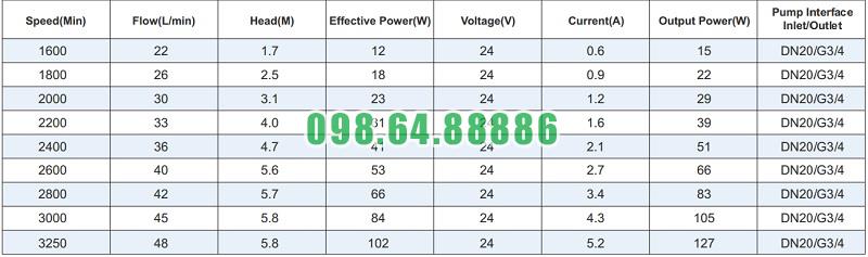 Bảng thông số kỹ thuật bơm hóa chất điện áp 24v và 48v TDM-200PERU-DC24