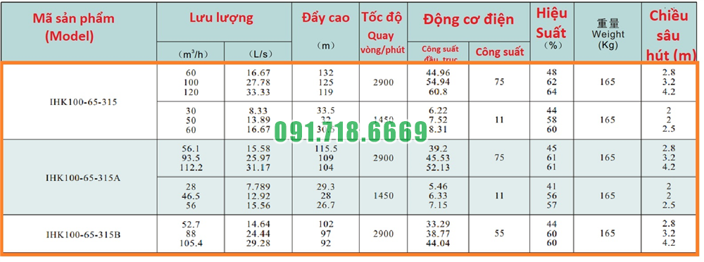 Bảng lưu lượng của máy bơm cánh hở li tâm trục ngang IHK100-65-315 inox 316