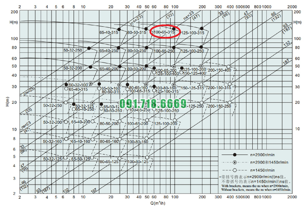 Đường cong hiệu suất của máy bơm cánh hở li tâm trục ngang IHK100-65-315 inox 316